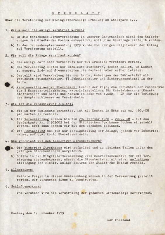 Im Jahre 1977 folgten weitere Baumaßnahmen. Dazu zählten unter anderem die Erneuerung des kompletten Daches des Vereinsheims für 13.000 DM und die als größte Baumaßnahme der letzten Jahrzehnte geltende Verlegung von 10.000 m Erdkabeln in der gesamten Anlage. Somit erhielt jeder Garten einen Stromanschluss mit Zähler. Diese in Eigenarbeit durchgeführten Maßnahmen, brachten allen Gartenmitgliedern erhebliche Vorteile. Daher sollten die Kosten in Höhe von 46.000 DM, an denen sich jeder Gartenbesitzer mit 450 DM beteiligte, durchaus gerechtfertigt gewesen sein.